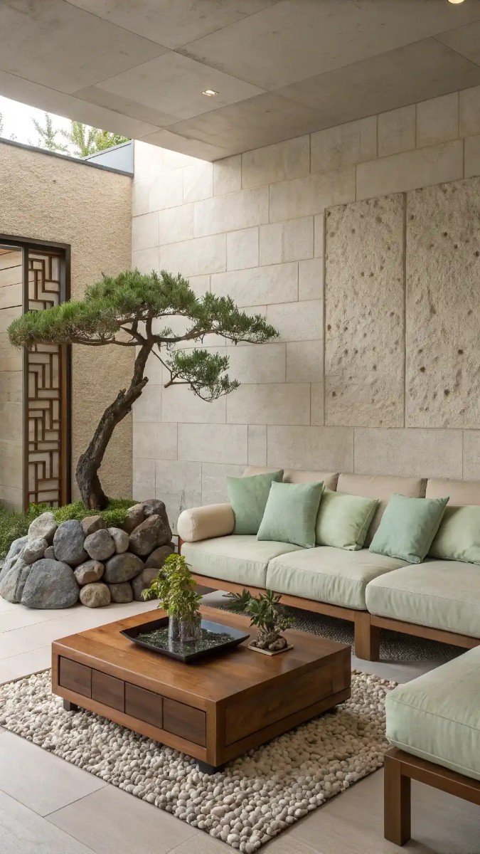 I've found that incorporating natural elements, like the bonsai tree and the pebble flooring, significantly enhances the organic feel. The warm wooden coffee table and the textured stone walls ground the scene, preventing it from feeling too stark. This thoughtful combination speaks to a very sophisticated aesthetic.
