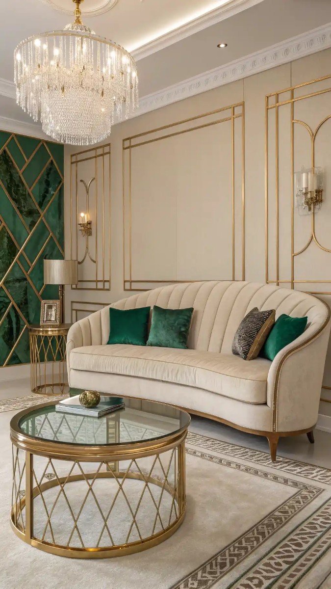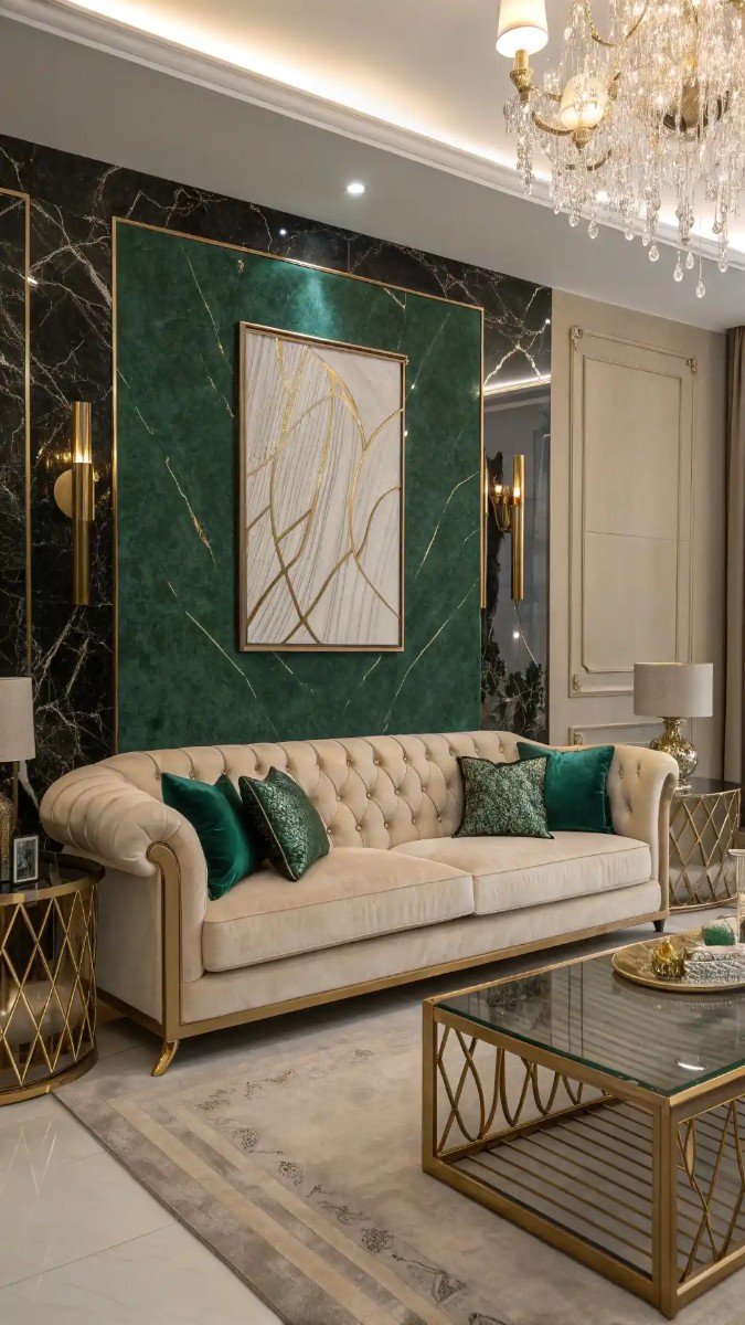 What makes this particularly noteworthy is how seamlessly this design blends classic luxury with a refreshing touch of nature. The beige sofa provides a gorgeous neutral base, allowing the vibrant emerald green accents to truly pop without overpowering the space. It’s a sophisticated and inviting aesthetic.