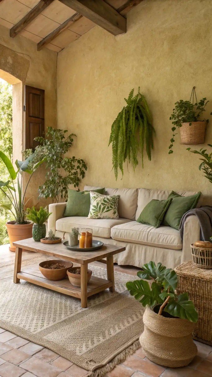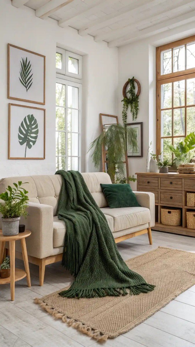 This aesthetic perfectly captures serene beige sofa living room ideas with green, showcasing how thoughtful layering of natural textures and colors can create a truly compelling and harmonious environment.