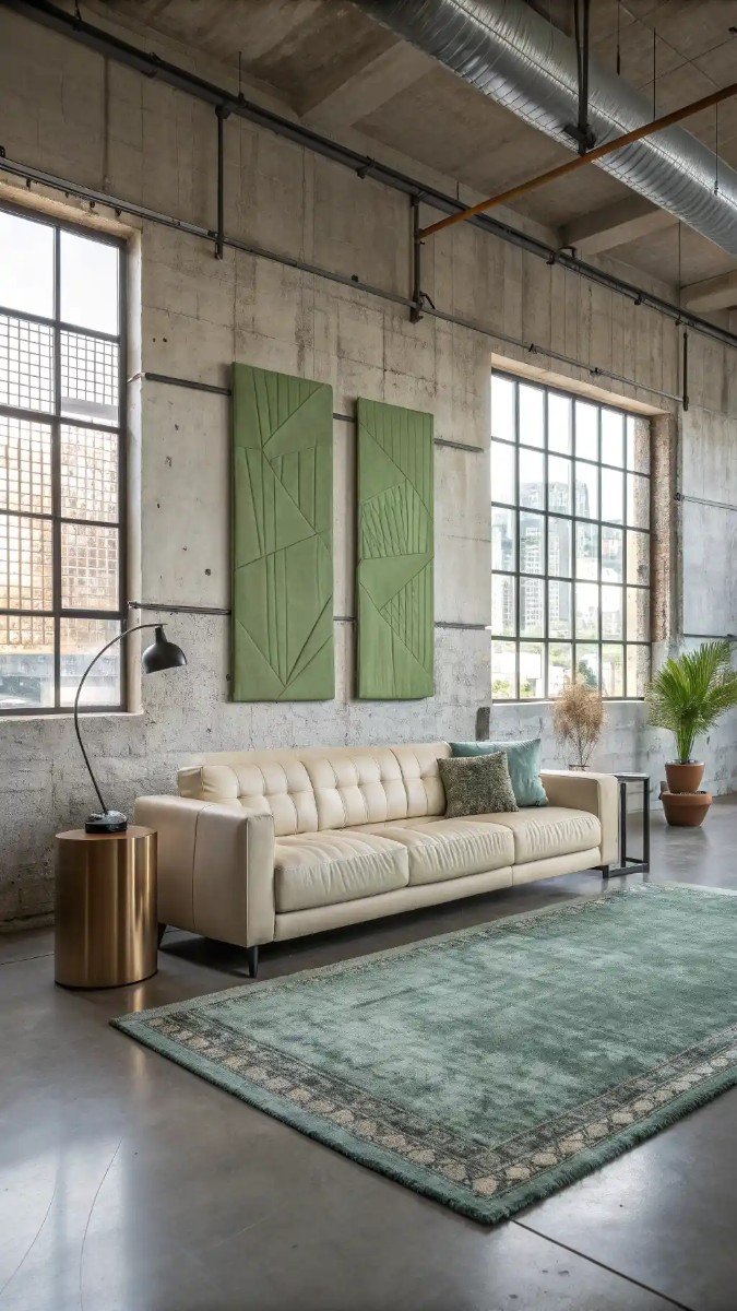 What draws me to this is the masterful use of color to soften a very raw, industrial space. The combination of a beige sofa with green accents creates an inviting oasis against the concrete backdrop. It's a testament to how specific color palettes can truly transform a room.