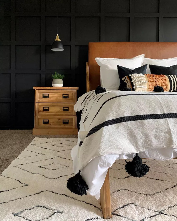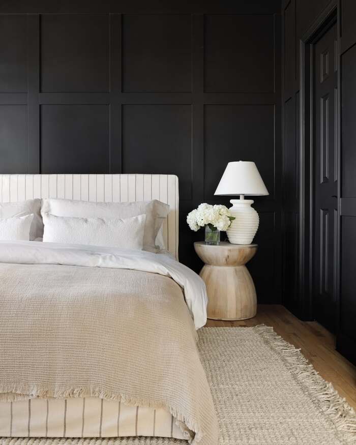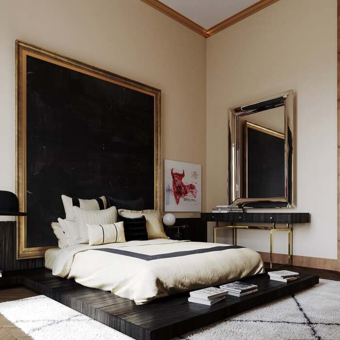 The low black platform bed with a giant framed black panel is theater. Beige bedding with black trim keeps it sharp. If you’re not building a platform, fake the effect.