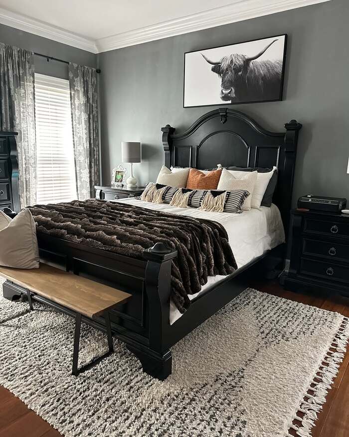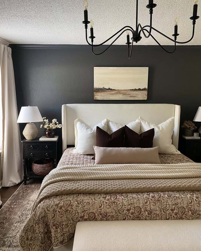 Black accent wall, creamy headboard, cocoa pillows, and a paisley quilt. It sounds busy, but the colors are controlled so it feels restful. This is my favorite trick for mix fans.