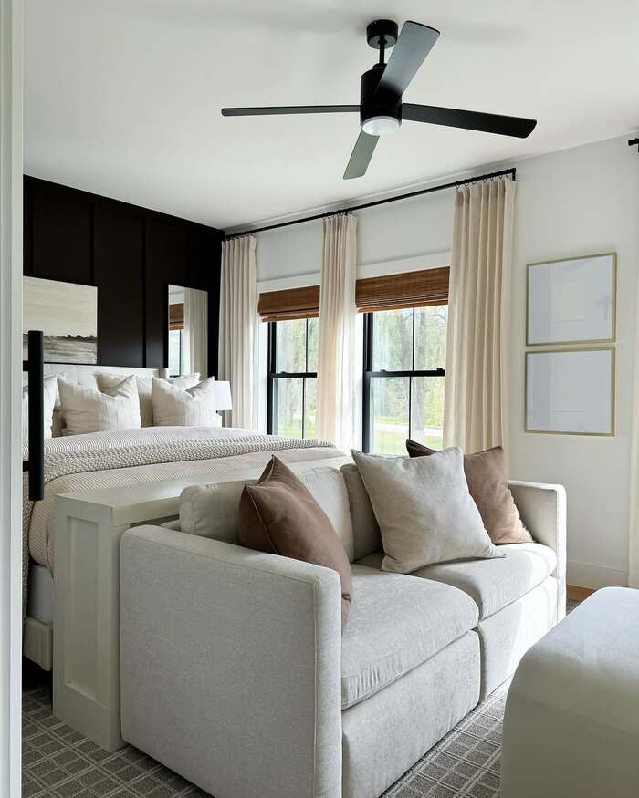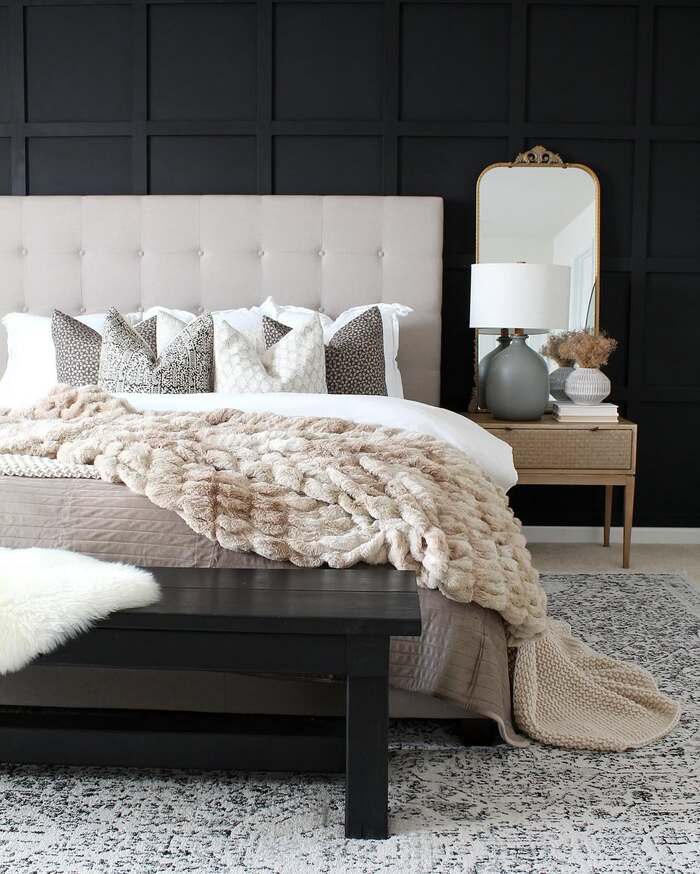 A beige headboard against a black box wall is luxe without trying hard. The fur throw says nap now. Layer quilts in two tones, taupe and greige, for depth. If you have a bench, paint it black so it ties to the wall. And add one mirror with a soft gold edge to bounce warmth back. It stops the black from swallowing all the light.
