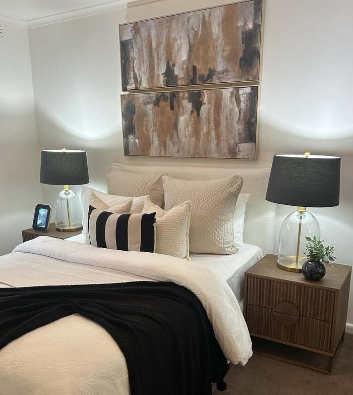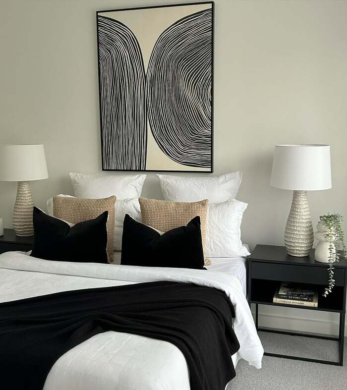 Graphic black and cream art does all the heavy lifting here. Then the bed stays calm with crisp white and a black throw draped low. My pillow math still works. Two euro shams, two standards, one lumbar. Add a pair of textural lamps so the nightstands don’t feel flat.