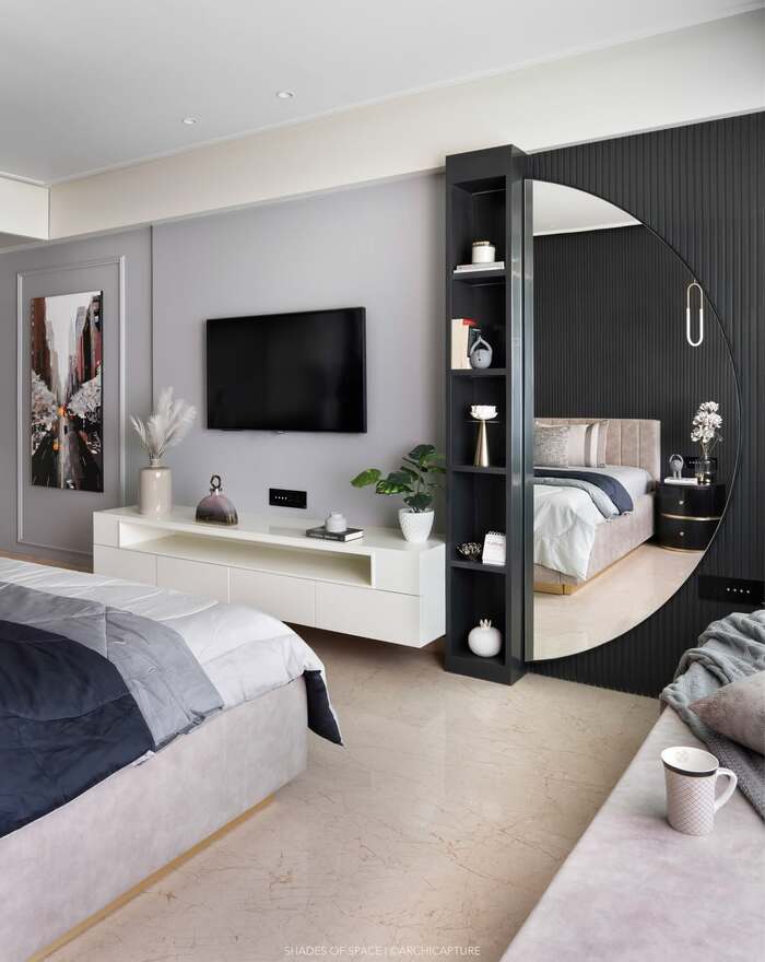 That round cutout with the vertical black slats is a show piece. It separates zones without walls, which is perfect in apartments. Keep everything else minimal. Floating console, low decor, soft gray bedding.