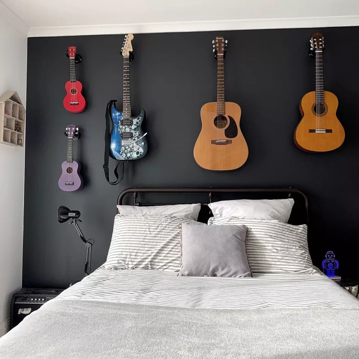 Music lovers, this is your move. Hang instruments on a matte black wall and the whole room turns into a gallery. Keep bedding simple, thin stripes or solids, so the guitars are the stars.