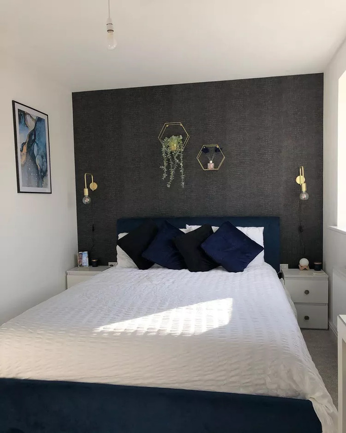 A dark textured panel behind the bed sets a moody stage, then the navy headboard and pillows add richness. Little brass sconces bring that tiny sparkle you need with deep colors.