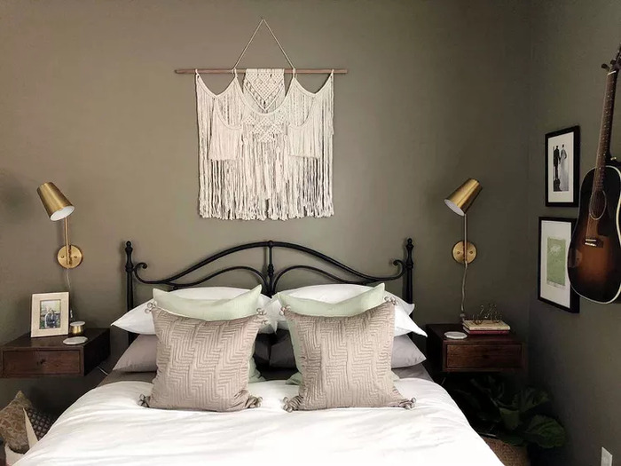 This one proves black and beige can lean earthy. Olive paint wraps the room, the iron bed adds the line, and that macramé softens all the edges. Brass swing-arm sconces are both pretty and practical for reading.