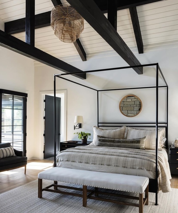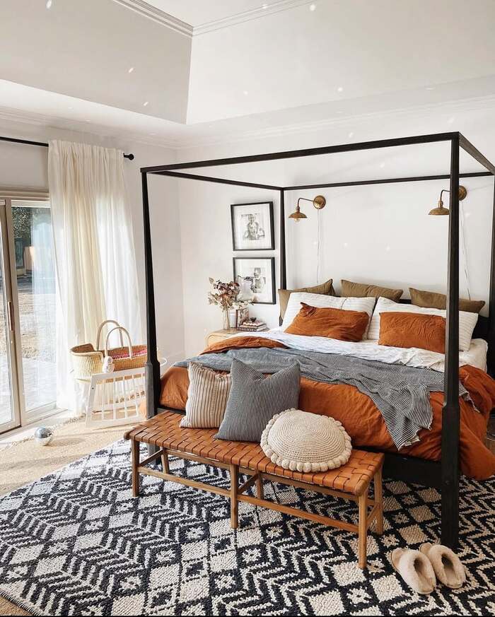 The airy iron canopy is a win because it frames the bed without eating the room. Rusty pillows and a black and cream rug make the whole space feel alive.