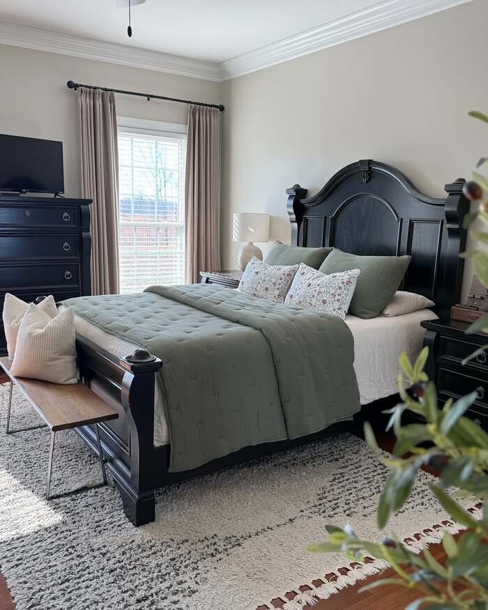 This room sneaks in green-beige bedding against black furniture and it totally works. It’s like nature came in and said hi. If you crave a color hit, go muted and earthy so the combo stays calm.