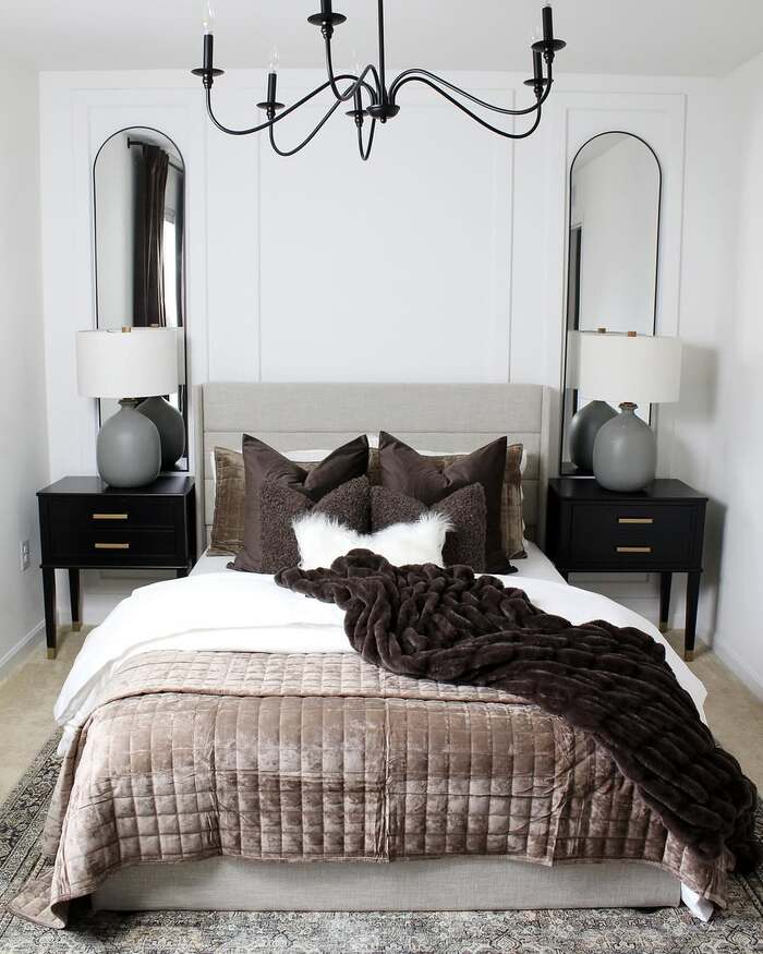 The arched mirrors behind the nightstands bounce light and make the headboard look taller. Smart and cheap compared to custom built ins. The chocolate throw is a touch moody, which I love. Copy the chandelier silhouette if your ceiling is plain. A single dramatic shape up high balances all the rectangles down low.