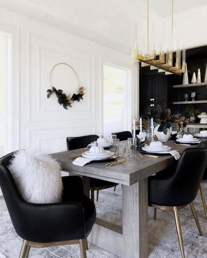 This last setup is black, white, and a little gold, and it works so well. The table is substantial, the chairs are dark with warm metal details, and the chandelier is a geometric gold statement. There’s also a wreath on the wall, which is such a simple touch but it softens everything. It makes the room feel welcoming, not strict.