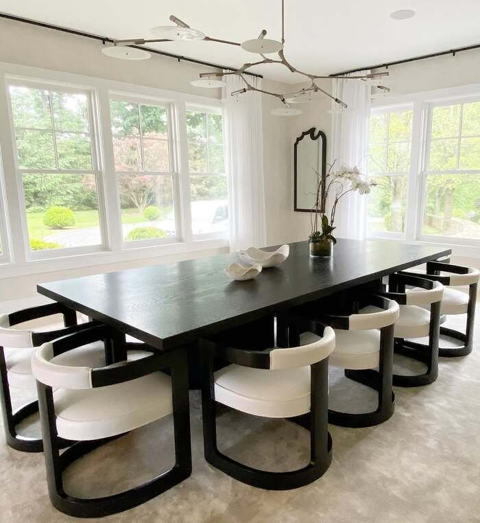 This one is dramatic in the best way. A long black table stretches across a bright window wall, and the chairs are these creamy, rounded shapes that feel modern but still comfortable. The ceiling light is super sculptural, like it belongs in a gallery, but the room still feels livable because it’s mostly just light, air, and simple shapes.
