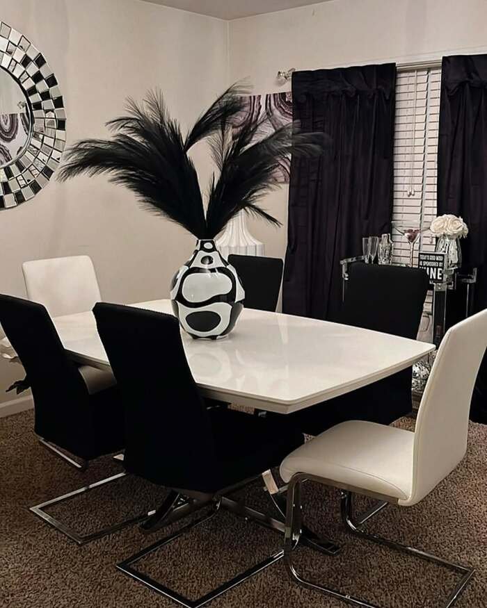 If you want this black and white dining room decor vibe at home, start with the table shape. Round tables are friendly and they save space because you can squeeze chairs in without bumping corners. Go for chairs with a soft curve so it feels cozy, not sharp. Then keep the center decor super simple: one round vase or one sculptural bowl. If you add too many little items, it starts to feel cluttery fast.