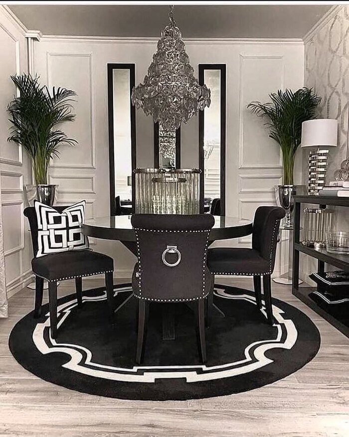 This is the “I’m feeling fancy” dining room. There’s a black round rug with a bold white pattern, a shiny chandelier, and tall mirror panels behind the table that bounce light everywhere. The chairs are black with nailhead trim, which gives that classic glam feel. And there are tall plants in shiny pots, like the room is dressed up for a party.