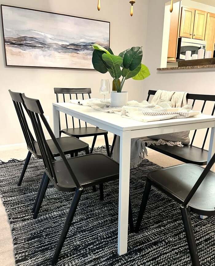 This one is more everyday, and that’s why it works. A white table with black spindle chairs looks classic, like it’ll never go out of style. Then there’s a bench, which is honestly a space-saver and a vibe. The rug is dark and textured, and the decor is minimal: a plant, a soft throw, a calm wall art piece.