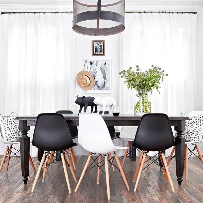 To copy this black and white dining room decor look, focus on the “big pieces” first. Get one long table (or even a black dining table top with simple legs). If your room is small, you can still do the long-table effect by using a narrower table. The chairs matter a lot here. If the table is dark, go lighter on the chairs so the room doesn’t feel heavy.