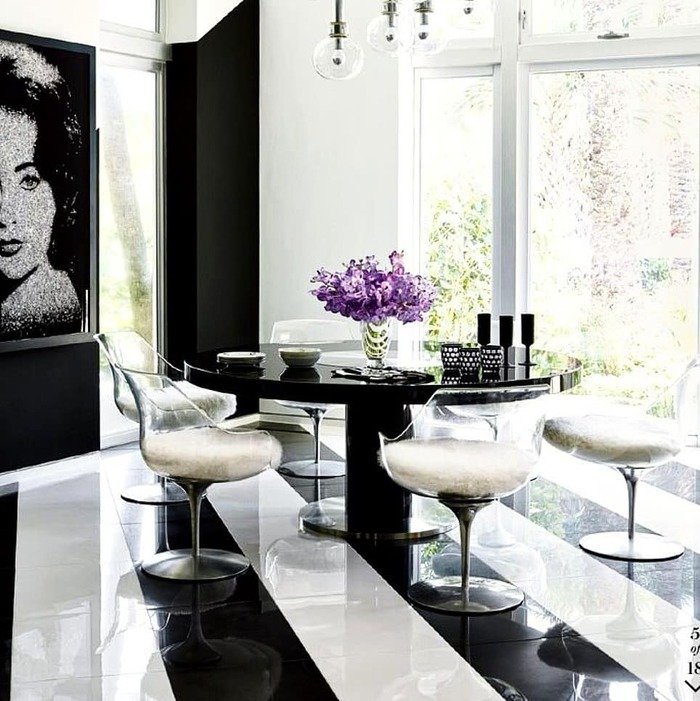 Okay this one is wild in a sleek way. The table is glossy black, the chairs are clear (ghost chairs), and the floor is bold with black-and-white stripes. There’s also a large portrait on the wall, which makes the space feel like a modern art moment. It’s not shy at all.