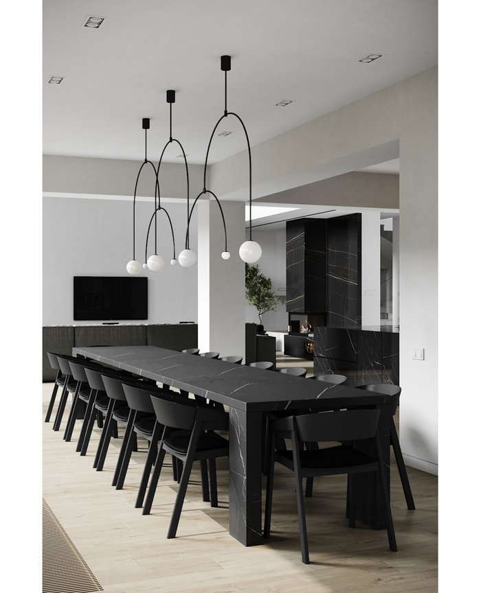 This one is minimal to the point where it almost feels like a spa. There’s a long black table, black chairs, and two big white pendant lights hanging like smooth jars. The wall is textured gray, and there’s basically no decor besides a low branch arrangement. It’s quiet, clean, and kinda powerful.