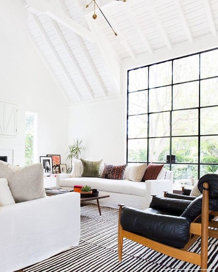 To copy, keep your palette creamy rather than stark white if your room gets lots of daylight. Warm whites pair better with wood tones. Use thin black lines in lamps or side table legs to echo the window frames. Pick one sculptural vase and keep greenery simple. Eucalyptus or olive branches look fancy even from the grocery store. Stack a few neutral books on the table to finish the scene.
