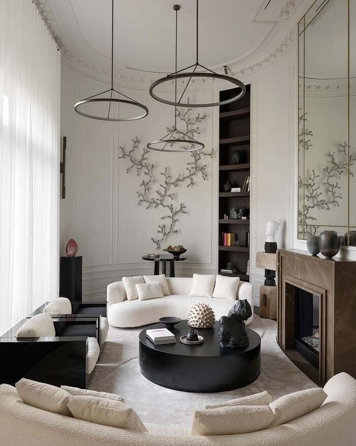 That graceful salon with cream boucle curves and a round black coffee table feels calm like a deep breath. The ring pendants float above without blocking sight lines, and the sculpted wall branches add movement. I’m obsessed with how the sofas mirror the room’s shape. It’s basically a hug you can sit in. The palette stays tight, which lets art objects sit brave on the table without shouting.