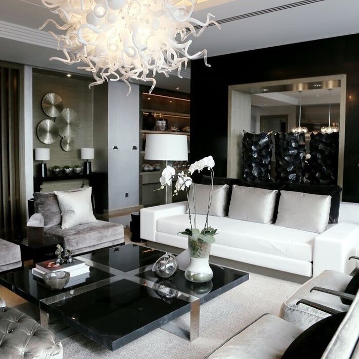 This room is glossy in the best way. A white sofa sits against a deep charcoal wall, velvet chairs pick up the sheen, and the black square coffee table gleams. The octopus-style chandelier is wild, but it works because the rest stays disciplined. Metals are cool and consistent, and the orchids repeat the white from the sofa so nothing feels random.