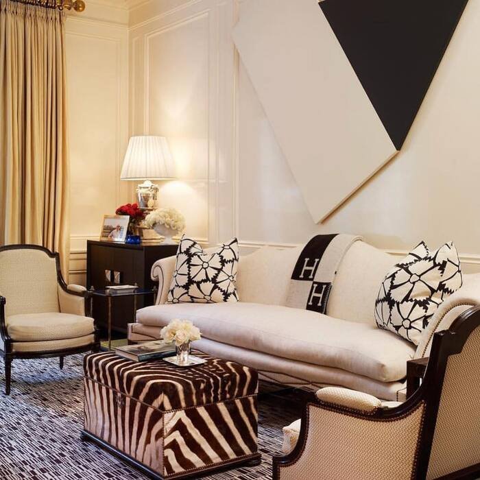 Copy plan. Start with traditional shapes in soft white or ecru. Add black by piping, frames, or slim tables instead of big blocks. Choose a single animal print in a tight colorway. Zebra or dalmatian are easiest with black and white lounge schemes. Finish with warm lampshades and a small vase of white roses. Instant hotel lobby feeling, but you can still put your feet up.