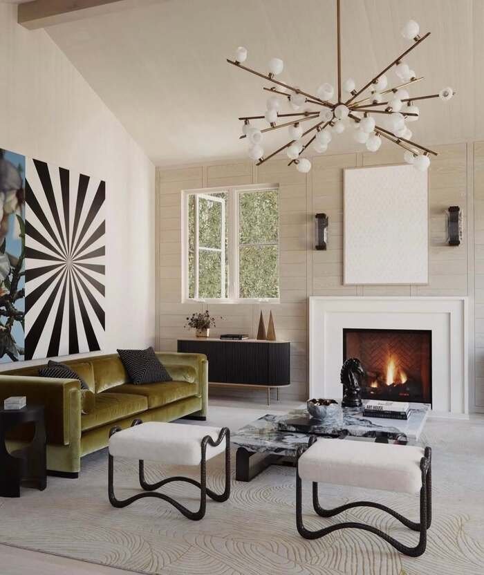 I didn’t expect to love a green sofa in a black-and-white living room, but this one slaps. The giant starburst art brings high drama, which lets the sofa act like a calm friend. Wavy-legged stools echo the art without copying it. The marble table pulls both the black and the white together, literally, so the palette stays loyal.
