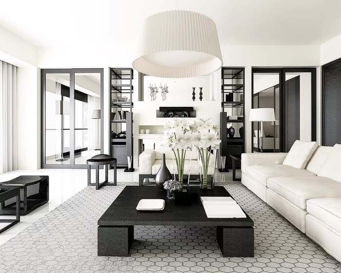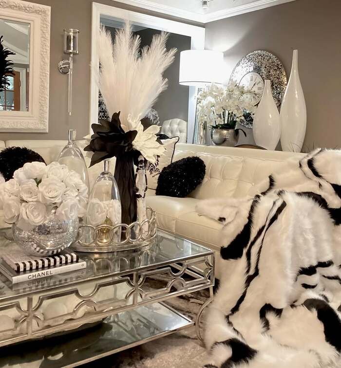 Do this by pairing one mirrored piece with matte ceramics and soft textiles. Put decor on trays so the reflections stay tidy. Keep flowers monochrome. White roses or orchids read chic in black and white decor rooms. If you’re worried about coldness, add a taupe wall color like this space did. It’s a cheat code that makes all the white glow and all the black feel cushy.