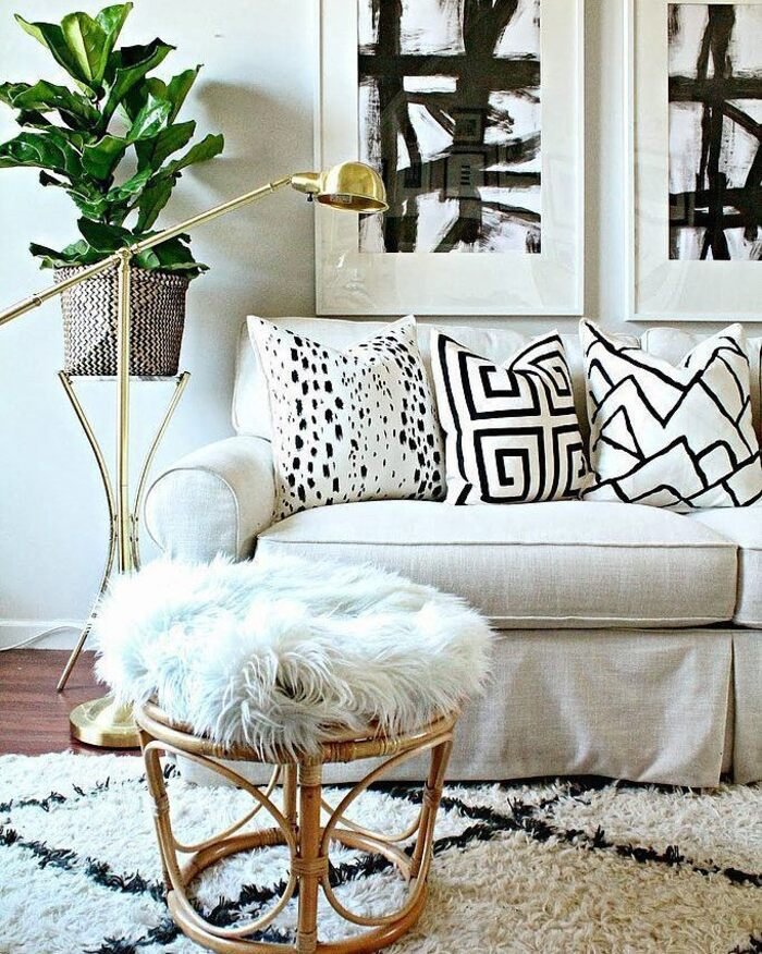 This vignette is proof that you can get a stylish black and white living room decor look with pillows and art alone. The sofa is simple, the art looks hand-brushed, and the rattan ottoman with a fluffy topper gives the corner a tiny boho wink. Brass lighting brings warmth without adding color. It’s friendly, affordable, and renters can copy it in one afternoon.