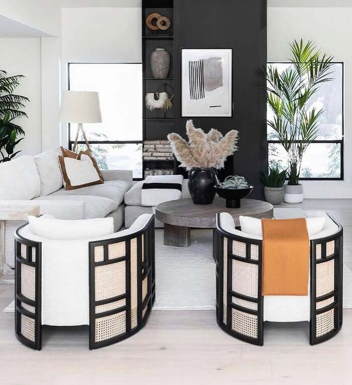 Those curved chairs with cane panels are everything. They bring texture and a tiny vintage hit into a clean modern room. A charcoal column wall with built-ins creates depth, and light sofas keep the space airy. Pampas in a black vase repeats the soft-curved theme without going sugary. This is the balanced end of black and white living room decor, where earth tones sneak in but don’t take over.