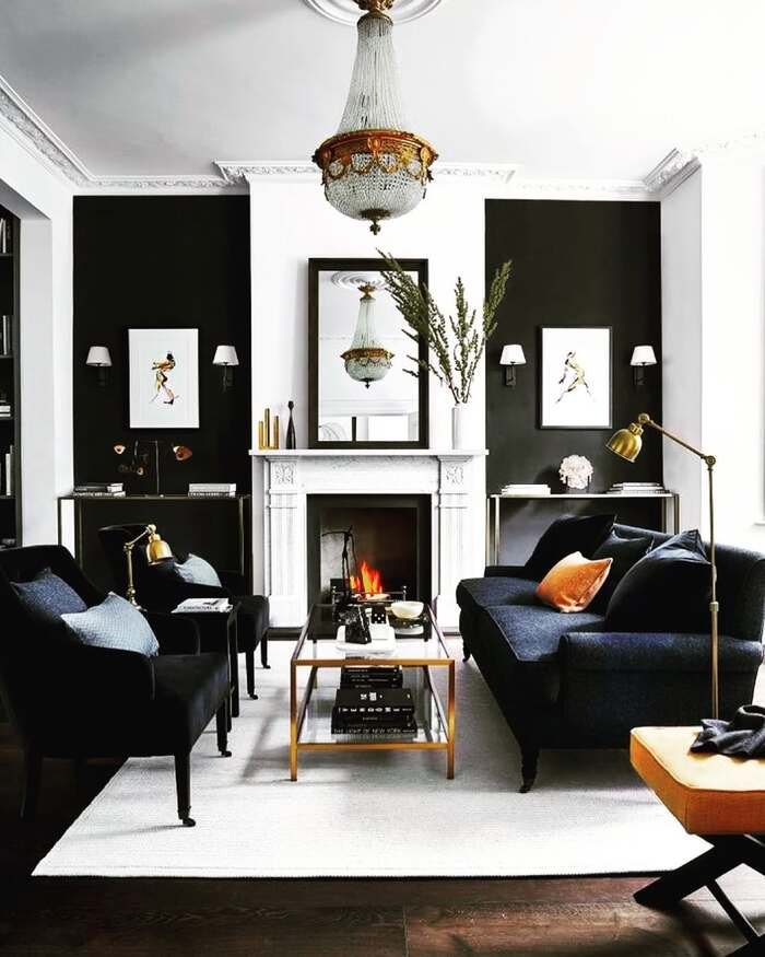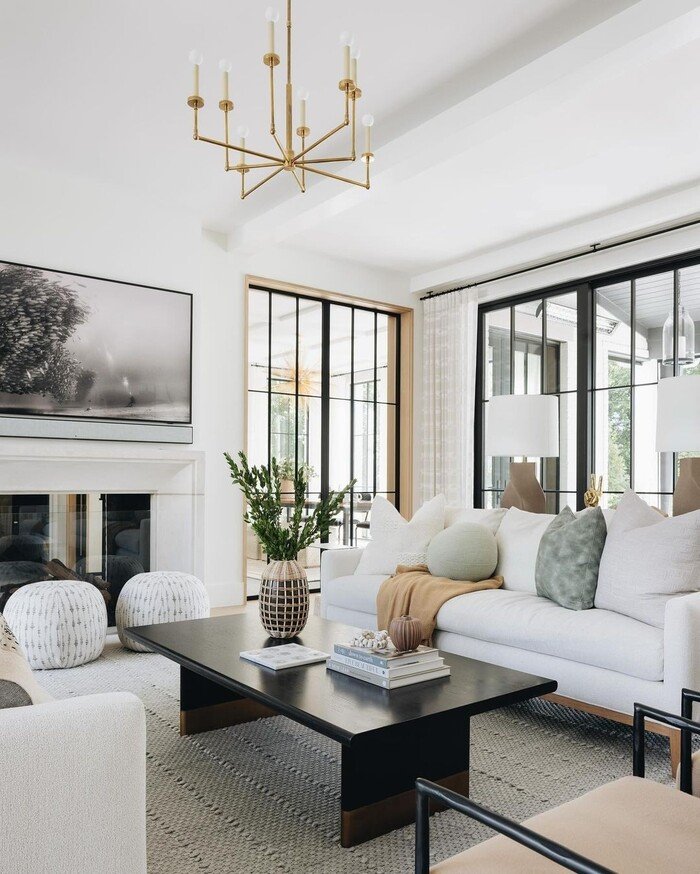This living room blends traditional bones with modern furniture. White sofa, black coffee table, soft wood floors, and a gold chandelier. The windows have black steel frames that feel architectural. It’s calm and high end but also livable. I’m into the rounded poufs by the fireplace. They add shape without adding color, which is a good trick if you want depth in black and white living room decor but not more pattern.