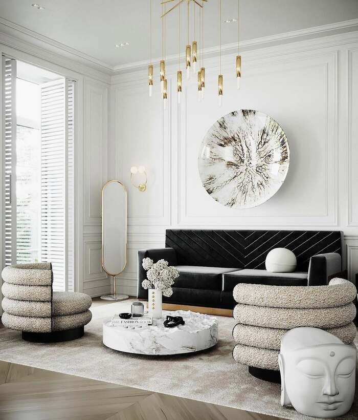 This room is a showstopper. A black herringbone sofa sits against paneled white walls, and the chairs look like stacked marshmallows. A round marble coffee table, gold lighting, and a giant abstract disc on the wall turn the space into an art moment. I’m not usually brave, but I’d totally try these sculptural chairs. They’re like conversation starters. The vibe is luxury hotel minus the lobby noise.