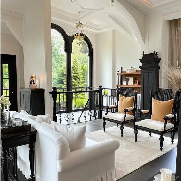 Final idea is classic and airy. Black iron arches frame the green outside, white sofas line up neatly, and two black carved chairs with wheat cushions add a touch of tradition. The black cabinet and newel posts tie into the window frames so the palette feels built-in, not tacked on. A simple white rug keeps everything graceful.