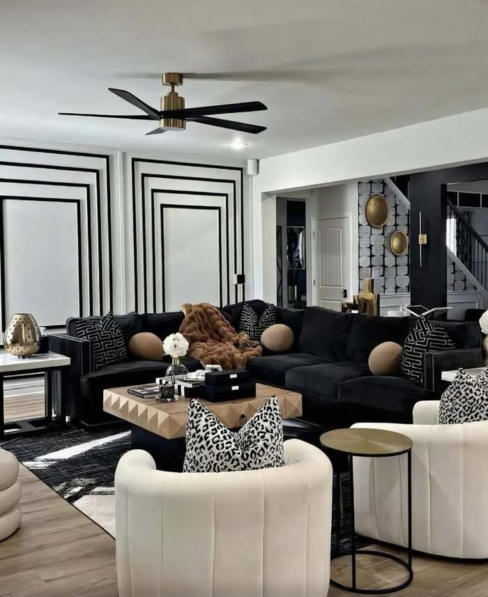 I saved this room for the graphic wall treatment. Thick black outlines on white walls create instant drama, and the black sectional is piled with patterned pillows. Leopard prints, circles, and solids mix together but share the same palette. The coffee table brings in geometry with a faceted base. The overall effect is playful but grown up. My confession. I copied the wall trick with removable vinyl lines. It took an hour and I felt like a magician.