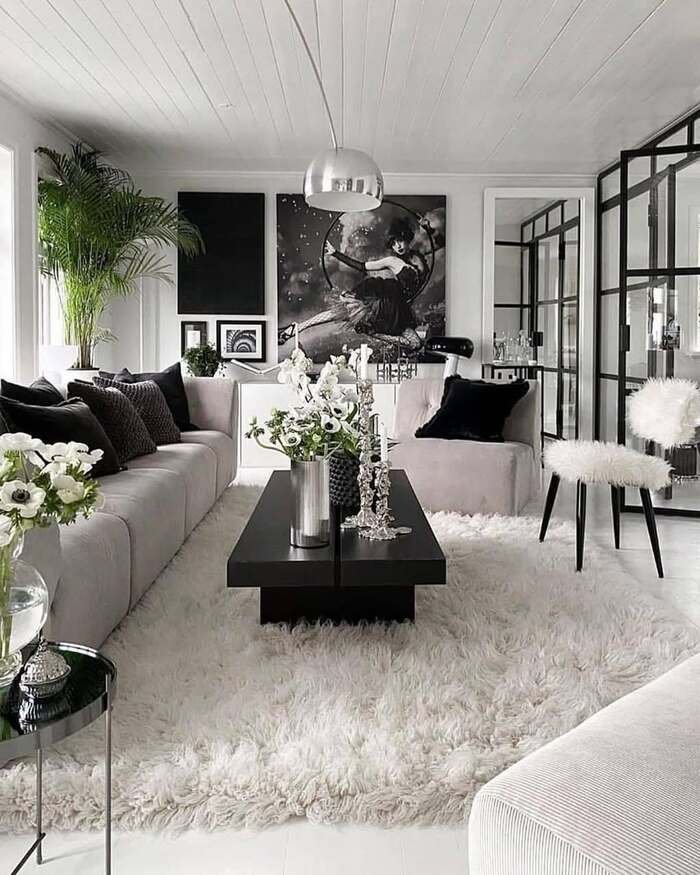 Here the fluffy white rug is the star. Everything else supports it. Pale sofas, a black block coffee table, chrome floor lamp, and black and white art. The contrast between soft rug and hard edges hits that cozy-modern sweet spot. I’d gladly lose my shoes here. The trick is to choose a rug with real texture, not just a flat weave. The loftier the pile, the more inviting the black accents will feel.