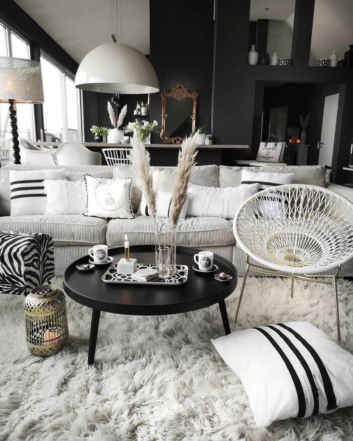 This living room mixes black walls, a white dome pendant, a striped sofa, and a shag rug. Pampas grass in a clear vase adds movement. It’s proof that black and white living room decor can lean natural. The zebra stool and striped pillows give rhythm without yelling. Also, that low black coffee table keeps the center calm even with all the patterns. I’m not brave with prints, but stripes are my safe zone.