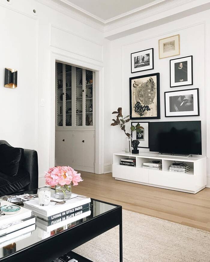This compact room mixes a gallery wall around the TV, a white media unit, and a black glass coffee table. Pink flowers surprise in the best way. The art picks keep to grays and creams so the room stays neutral, and that’s the trick with gallery walls in a black and white living room. Choose frames in two finishes at most and keep the art tonal. Then you can add a little color with flowers or a book spine and it won’t crash the party.