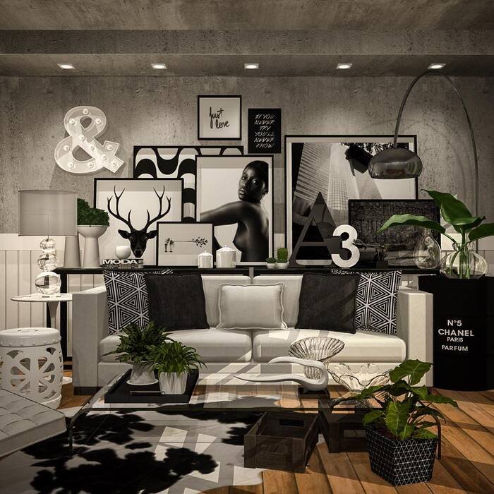 Here we get brave. The wall behind the sofa is filled with stacked black and white prints, numbers, quotes, and a deer silhouette. The furniture runs simple so the wall can shout. White sofa, black tables, graphic pillows. I love the confidence. It reminds me of a fashion studio. The cowhide rug brings organic shape that softens the grid of frames, which is key when you go maximal.