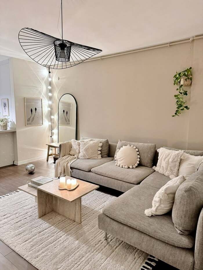 The last idea is small-space friendly and honestly romantic. A low gray sectional sits on a ribbed white rug. A stone-like square coffee table holds books and wavy candles. One dramatic black wire pendant floats like a wing above everything. Fairy lights trickle down a wall mirror. A tiny hanging plant adds a wink of green. It’s black and white living room decor boho tailored for weeknight wind downs.