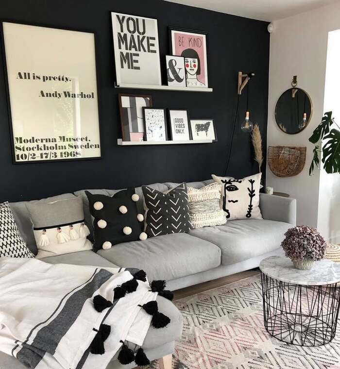 This one grabbed me right away because it’s graphic and playful but still cozy. The deep charcoal accent wall acts like a big stage. Floating picture ledges hold a mix of bold type posters, quirky sketches, and a cute little portrait. The sofa is soft gray and packed with patterned pillows. I count dots, chevrons, fringe, and one face pillow that makes me smile every time. A tassel throw sprawls over the chaise like it fell asleep there. The wire-base marble table keeps the scene light, not bulky.