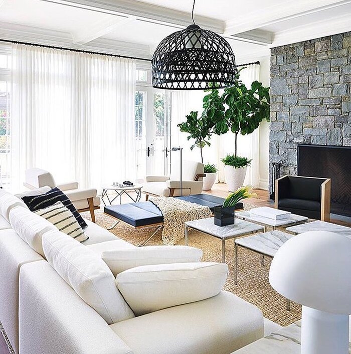 This space is like a weekend away. Sheer curtains filter tons of daylight, making the whole room glow. A huge black woven pendant hangs over clean white seating. The floor is grounded by a natural jute rug that adds grit so all the white doesn’t float off. The stone fireplace feels rugged, almost coastal. Touches of black show up in modern chairs, a striped pillow, and thin table legs. Plants are tall and sculptural, not fussy.