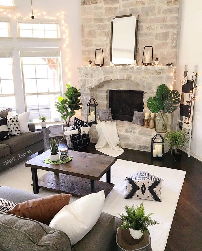 If your home screams cuddle season, this one’s your blueprint. A pale stone fireplace anchors everything. String lights trace the mantel arch like a necklace, and candle lanterns glow at different heights. The furniture leans simple, then the styling brings the boho: graphic pouf on the floor, black-and-white pillows, chunky throws, and a few leafy plants. The coffee table is warm wood, which keeps the black accents from feeling stark.