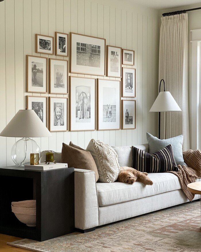 This idea proves boho can be sentimental and tidy. A wall of family photos in thin wood frames climbs above a pale sofa. The pictures are black and white, which creates instant calm. Pillows mix stripes with cozy knits, and a chunky throw basically begs for naps. The one strong black piece is a cube side table. It’s solid and geometric so all the soft textures don’t slouch. Drapes are pinstriped and hang high, which stretches the room.