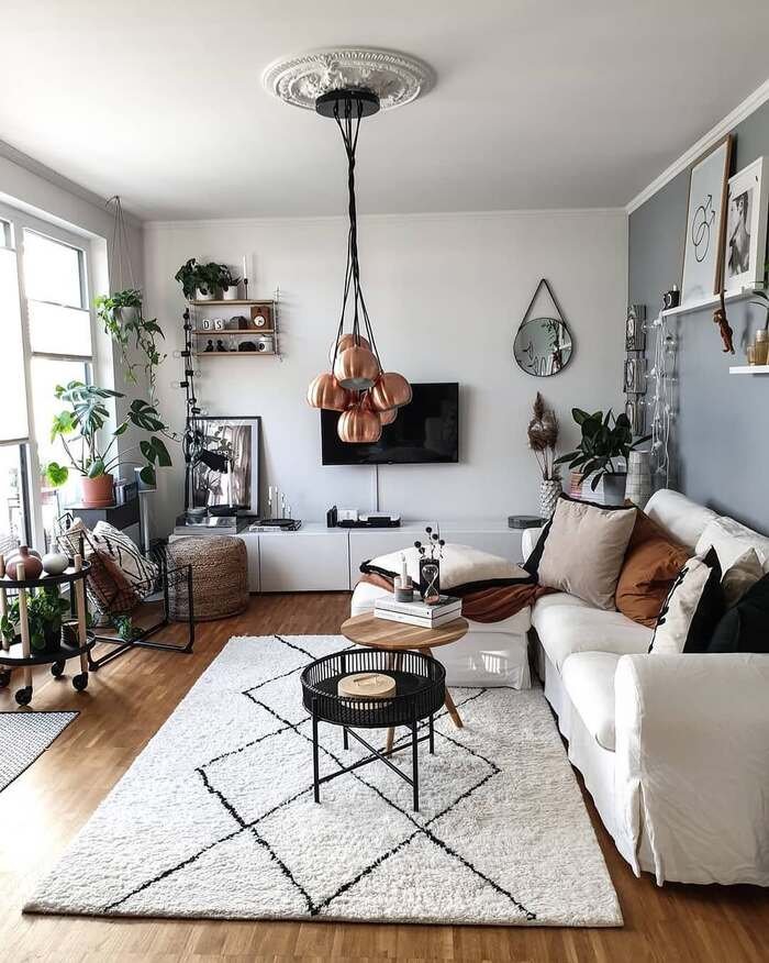 This space wraps you up with glow. The base is a white sofa and a plush white rug marked with thin black diamonds. Then copper pendant clusters drop down like warm jewelry. Small tables with black metal frames keep structure. Plants and baskets add life without turning into a jungle. It’s a boho monochrome living room decor move that mixes shiny with soft, which I didn’t know I needed till now.