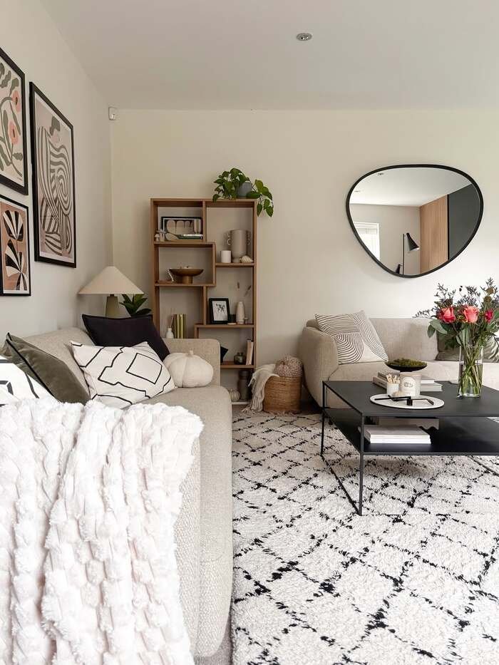 When I tried a similar setup, I messed up spacing and the art looked cramped. The fix: leave two finger widths between frames on the ledge and stagger heights so it feels collected. Keep the rug pale with a thin black motif so the wall stays the star. For easy black and white living room decor boho harmony, repeat black in small lines only, like the table base and frame edges. Add a round mirror and a hanging basket to bring in rattan warmth. It’s chill, a little cheeky, and very selfie friendly.