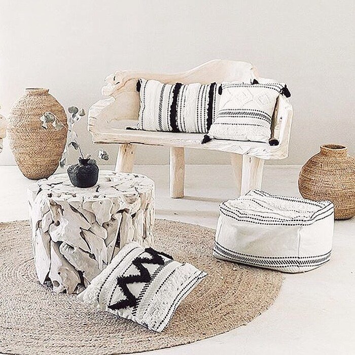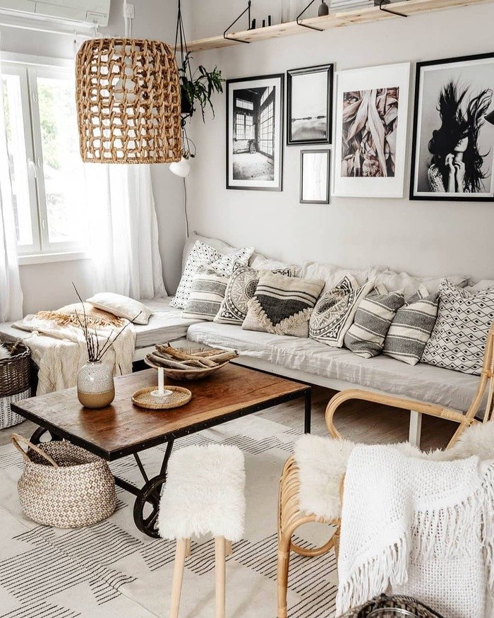 This look leans earthy. A wide rattan pendant, pale walls, and a gallery wall of black and white prints sit over a long casual sofa. There’s a vintage coffee table on little wheels that feels cheeky in the best way. Layers of pillows in tribal patterns stack along the back. A woven basket for firewood and stools with fuzzy tops add texture everywhere. It’s bohemian black and white lounge energy, equal parts handmade and collected.