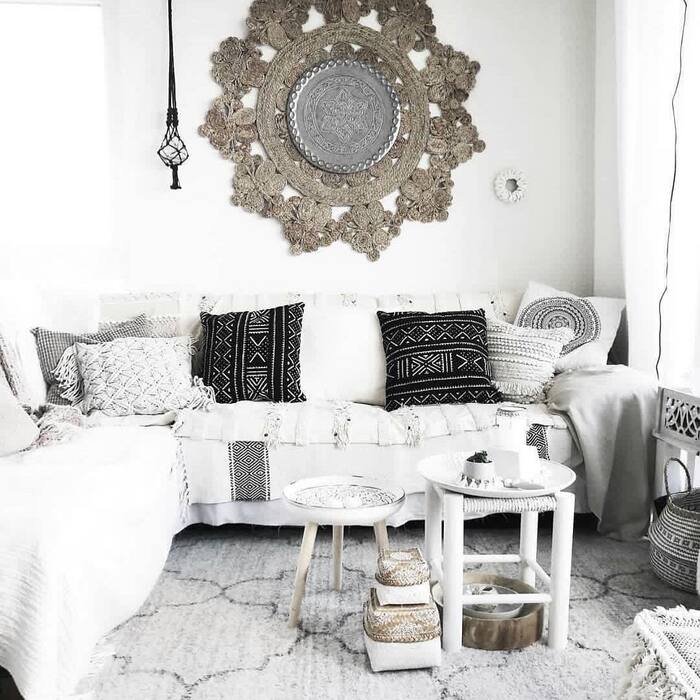 This space proves that white-on-white can still read boho. A giant crochet wall medallion centers the room. The sofa is slipcovered and scattered with black mudcloth pillows and tiny tassels. The rug is pale and chunky. Small stools and baskets tuck under the table for texture, not clutter. It’s a neutral boho black and white living space that whispers cozy without giving up that crisp look.