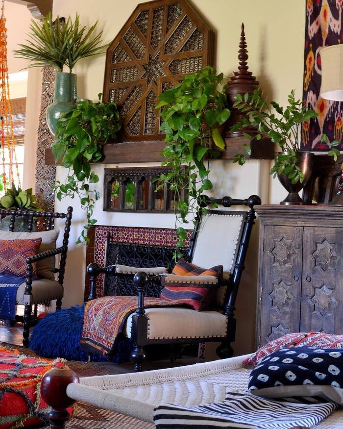 Maximal boho with carved wood, jewel textiles, and trailing plants