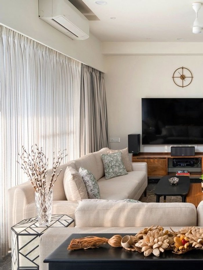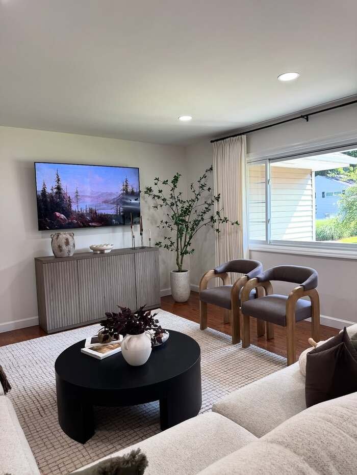 The last space wins for real-world layout. Narrow living area, giant TV, lots of daylight. The palette is creamy with black anchors in the coffee table and media pieces. If your space is small, a light base plus a few bold black shapes keeps things from feeling mushy. This is a great example of men’s black and white living room decor that works in apartments and rentals too.